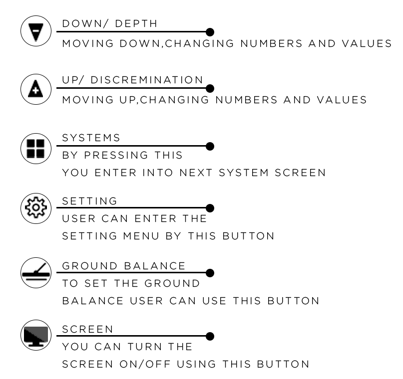 The menu system in the user interface provides an easy way to set various settings related to the search, such as sensitivity, ground balance, iron filter, threshold adjustment and other settings. It also provides the ability to set other options such as sound, screen brightness and backlight options.